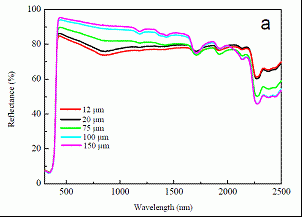 (b)不同厚度的樣品對太陽光的反射率