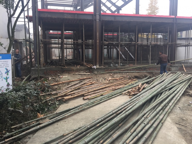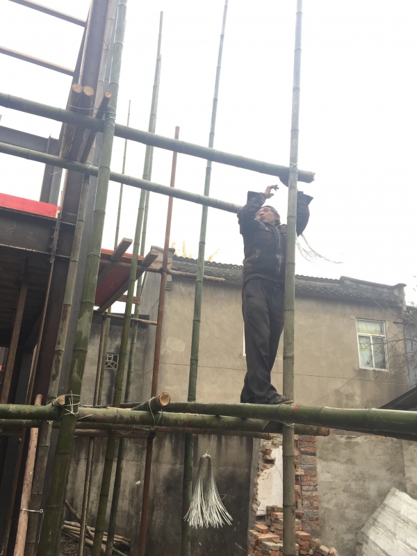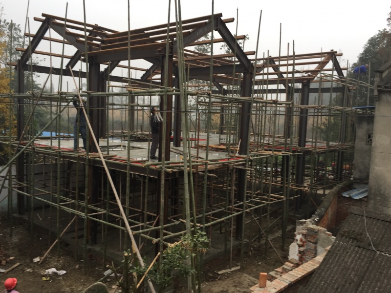 階段描述:結(jié)構(gòu)板混凝土養(yǎng)護(hù)作業(yè),穿插外側(cè)雙排腳手架的搭設(shè),為屋面工程和墻板安裝創(chuàng)造作業(yè)條件。為節(jié)省成本,采用了當(dāng)?shù)靥赜械拈褡鳛槟_手架的主材,搭設(shè)時(shí)控制好腳手架立桿間距和橫桿間距,其他其他附件如斜撐、剪刀撐等應(yīng)符合安全要求,以確保施工作業(yè)人員的安全。